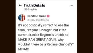 ٹرمپ نے اپنے سوشل میڈیا پلیٹ فارم ’ٹروتھ سوشل‘ پر ایک پیغام میں کہا کہ رجیم چینج کی اصطلاح شاید سیاسی طور پر درست نہ ہو، لیکن اگر ایرانی حکومت اپنے عوام کو وہ مقام نہیں دے سکتی جس کے وہ حقدار ہیں، تو پھر تبدیلی کیوں نہ ہو؟