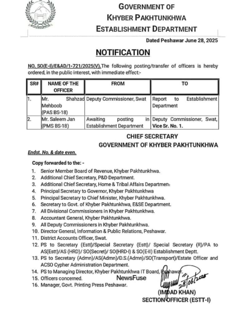 خیبرپختونخوا حکومت نے ڈپٹی کمشنر سوات کو تبدیل کردیا ہے۔
