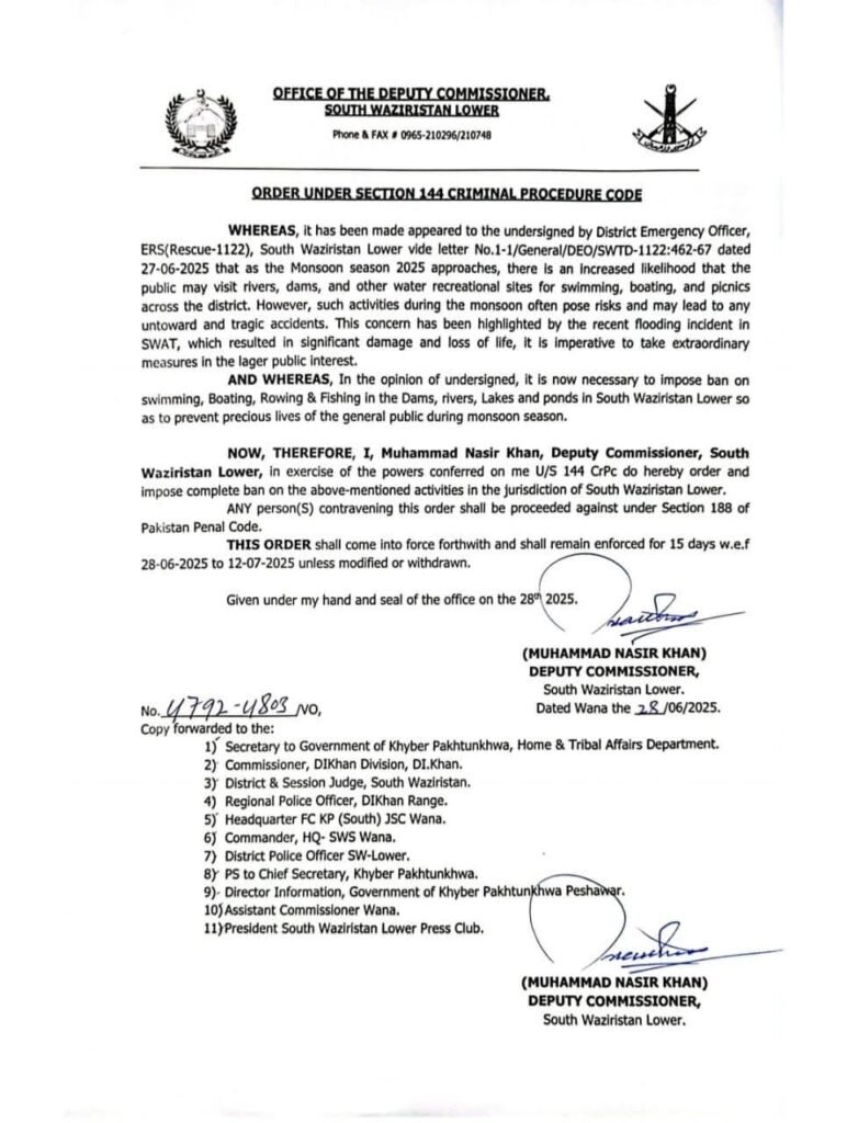 ضلع جنوبی وزیرستان لوئرمیں ضلعی انتظامیہ نے 15 روز کے لیے دفعہ 144 نافذ کر دی ہے، جس کے تحت آبی مقامات پر جانے، نہانے، کشتی رانی اور مچھلی پکڑنے پر مکمل پابندی عائد کر دی گئی ہے۔