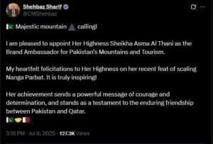 وزیرِ اعظم نے سوشل میڈیا پلیٹ فارم ایکس (سابقہ ٹوئٹر) پر اپنے بیان میں کہا کہ شیخہ اسماء الثانی کو پاکستان کی پہاڑوں اور سیاحت کی برانڈ ایمبیسڈر مقرر کرتے ہوئے خوشی محسوس کر رہا ہوں۔