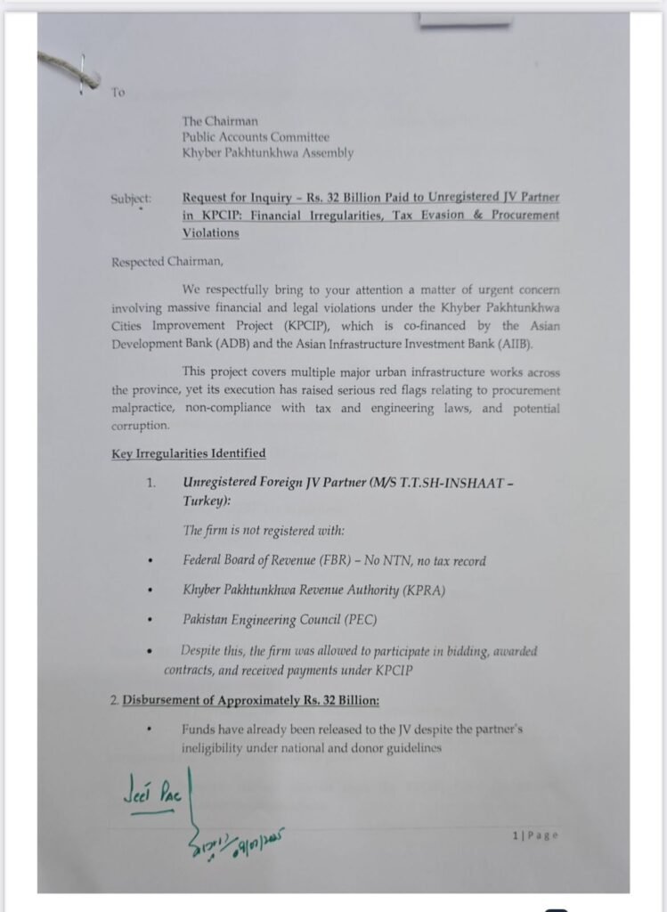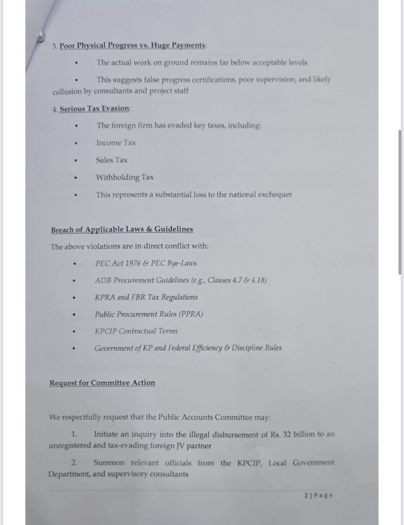 اراکین اسمبلی نے خط میں کہا ہے کہ غیر رجسٹرڈ کمپنی کو بولی میں شامل کرکے بڑے معاہدے کے حصول اور غیر قانونی طور پر کمپنی کو غیر معمولی مالی فائدہ پہنچایا گیا ہے۔ اراکین اسمبلی نے پی سی آئی پی، مقامی حکومت کے محکمے اور منصوبے کے مشیروں کے متعلقہ حکام کو طلب کرنے کا مطالبہ کیا ہے۔