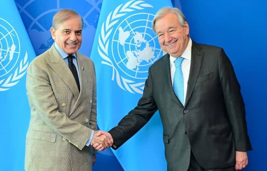 نیویارک: وزیراعظم محمد شہباز شریف نے اقوام متحدہ کی جنرل اسمبلی کے 80ویں اجلاس کے موقع پر سیکرٹری جنرل انتونیو گوٹیرس سے ملاقات کی، جس میں پاکستان کی عالمی کردار، کشمیر، موسمیاتی مالیات اور غزہ کی صورتحال پر تبادلہ خیال کیا گیا۔