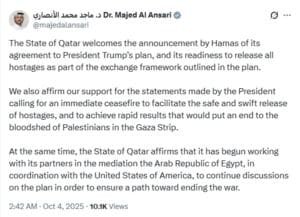 دوحہ: ریاستِ قطر نے اعلان کیا ہے کہ وہ فلسطینی مزاحمتی تنظیم حماس کے جانب سے امریکی صدر ڈونلڈ ٹرمپ کے پیش کردہ منصوبے سے متعلق معاہدے کے امکان کو خوش آئند قرار دیتی ہے اور منصوبے میں پیش کردہ تبادلے کے فریم ورک کے تحت تمام یرغمالیوں کی رہائی کے لیے تیار ہے۔