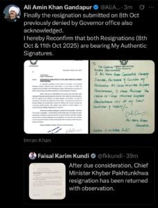 علی امین گنڈاپور نے ایکس پر جاری بیان میں کہا کہ دوبارہ تصدیق کرتا ہوں کہ 8 اکتوبر اور 11 اکتوبر کو جمع کرائے گئے استعفوں پر ان کے مستند دستخط موجود ہیں۔