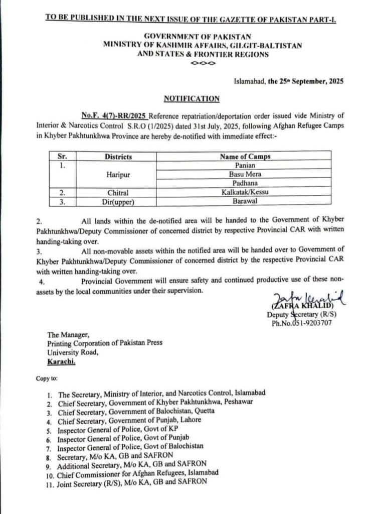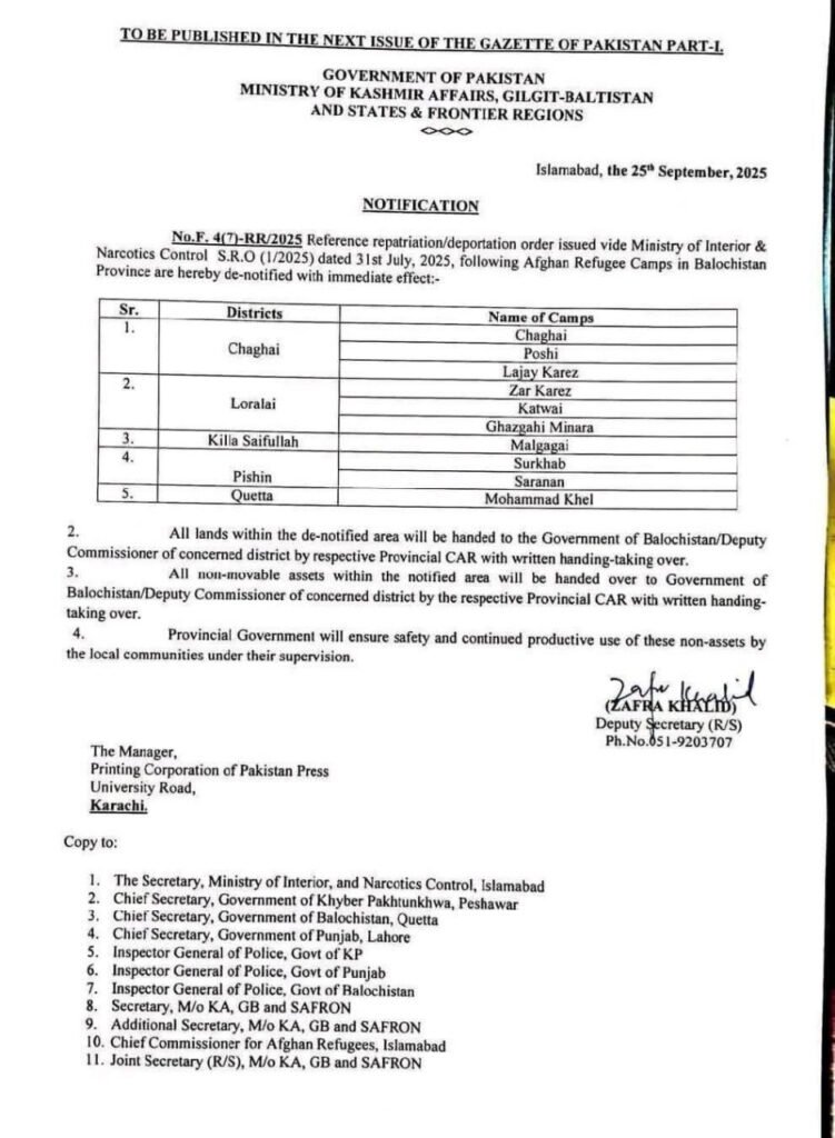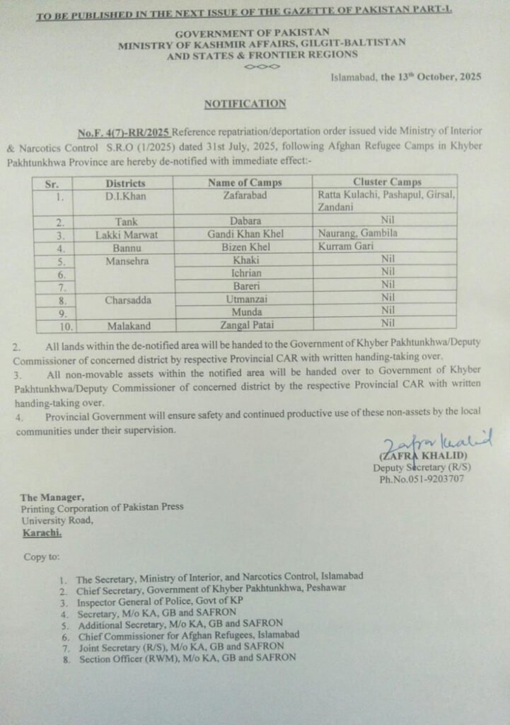 حکومت پاکستان نے تقریباً 45 سال قبل ملک بھر میں قائم کیے گئے افغان پناہ گزین کیمپوں میں سے 16 کو مکمل طور پر بند کرنے کے احکامات جاری کر دیے ہیں۔ وزارت سیفرون کے نوٹیفکیشن کے مطابق یہ کیمپ ہری پور، چترال، اپر دیر، لورالائی، قلعہ سیف اللہ، پشین، کوئٹہ، میانوالی اور دیگر علاقوں میں قائم تھے۔