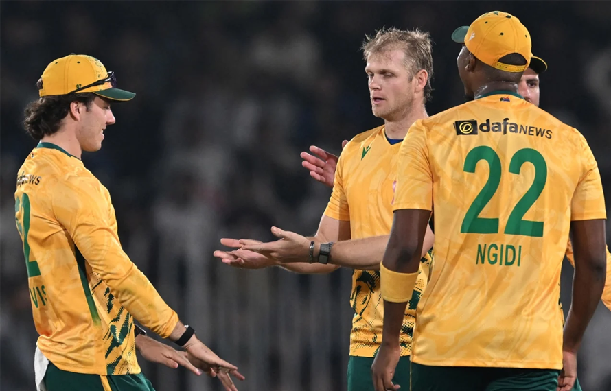 اس سے قبل مہمان ٹیم نے پہلے بیٹنگ کرتے ہوئے مقررہ 20 اوورز میں 9 وکٹوں کے نقصان پر 194 رنز بنائے تھے۔ ریزا ہینڈرکس 60، جارج 36 اور ٹونی ڈی زورزی 33 رنز کے ساتھ نمایاں رہے۔ کوئنٹن ڈی کاک 23 رنز بنا کر صائم ایوب کا شکار بنے۔