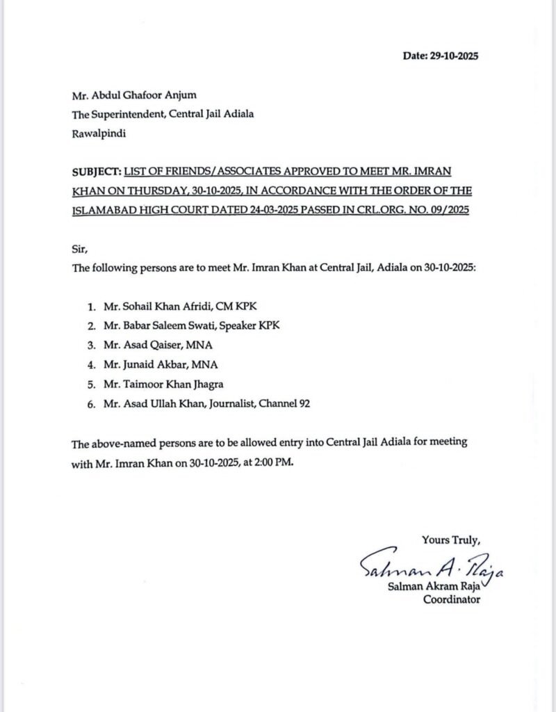 ذرائع کے مطابق جیل ملاقاتوں کی فہرست مرتب کرنے کی ذمہ داری سینیٹر علی ظفر کو دی گئی تھی لیکن پارٹی کے سیکریٹری جنرل سلمان اکرم راجہ نے علی ظفر کی جاری کردہ فہرست پر اپنی الگ لسٹ جاری کر دی۔