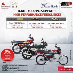 بینک کے مطابق CD 70 کی ماہانہ قسط 26,650 روپے، CG 125 کی 39,750 روپے اور CG 150 کی 76,650 روپے رکھی گئی ہے۔