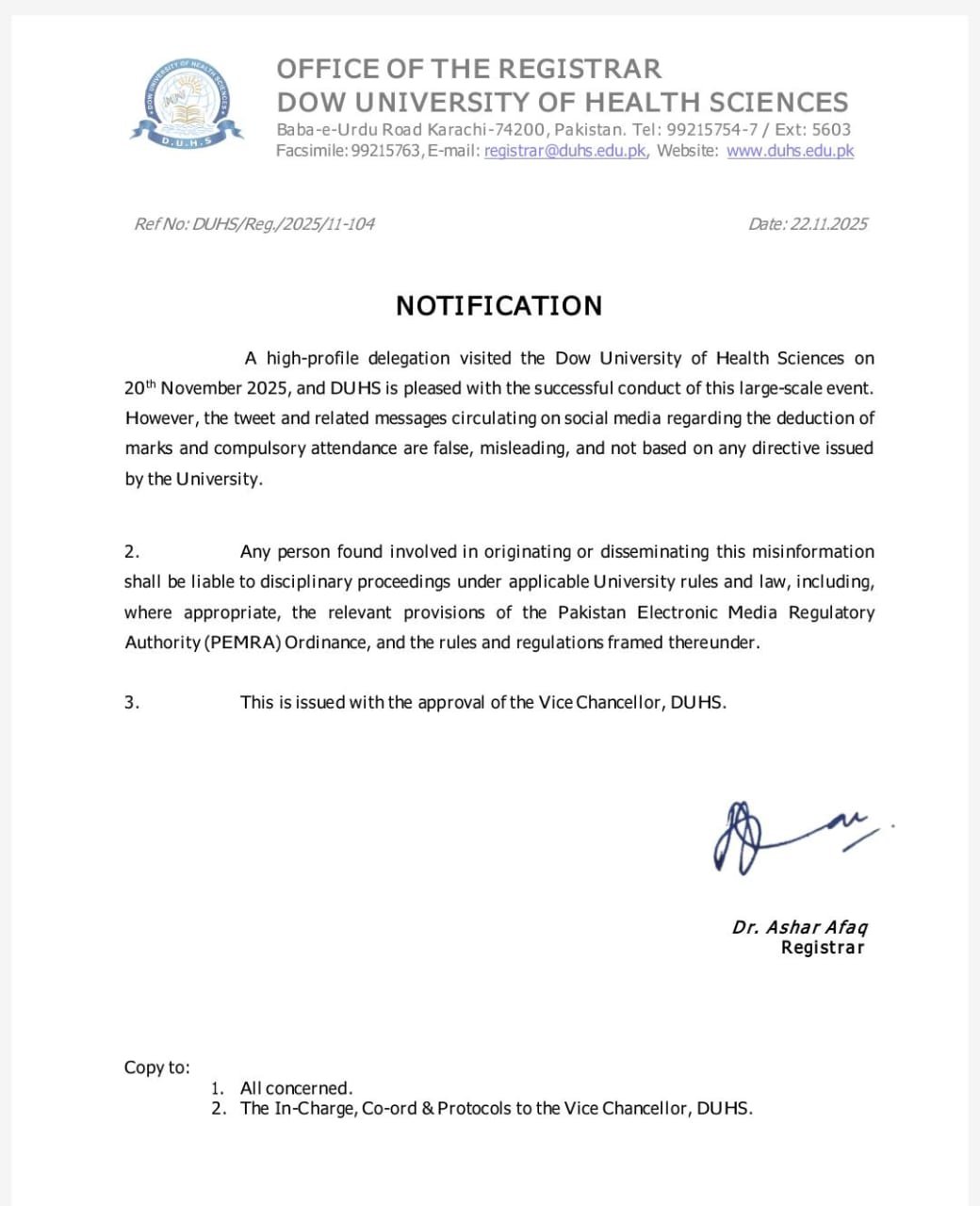 یونیورسٹی کی جانب سے جاری نوٹیفکیشن میں کہا گیا ہے کہ 20 نومبر 2025 کو اعلیٰ سطح کا وفد ڈاؤ یونیورسٹی کے دورے پر آیا تھا اور یہ تقریب کامیابی سے منعقد ہوئی ، بعض سوشل میڈیا پلیٹ فارمز پر جو پیغامات گردش کر رہے ہیں، جن میں طلبہ کے مارکس میں کٹوتی یا جبری حاضری سے متعلق دعوے کیے گئے ہیں وہ مکمل طور پر غلط اور یونیورسٹی کی کسی ہدایت کا حصہ نہیں۔