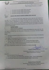 ایجوکیشن ڈائریکٹوریٹ نے نوٹیفکیشن تمام متعلقہ اضلاع کو ارسال کر دیا ہے اور سکول سربراہان کو ہدایت کی گئی ہے کہ وہ عمل درآمد یقینی بنائیں۔