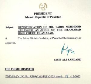اسلام آباد: صدرِ مملکت آصف علی زرداری نے وزیراعظم شہباز شریف کی ایڈوائس پر اسلام آباد ہائی کورٹ کے جج جسٹس طارق محمود جہانگیری کو ڈی نوٹیفائی کرنے کی منظوری دے دی ہے۔