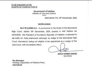 وزارت قانون کی جانب سے جاری نوٹیفکیشن میں کہا گیا ہے کہ اسلام آباد ہائی کورٹ کے 15 دسمبر 2025 کے فیصلے کے مطابق یہ فیصلہ فوری طور پر نافذ العمل ہوگا۔