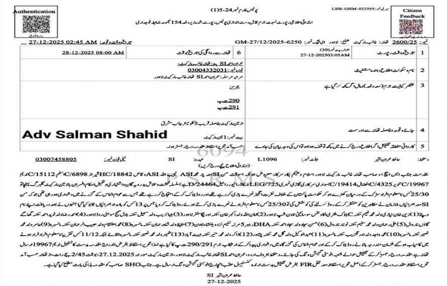 پولیس کے مطابق واقعہ 26 دسمبر 2025 کو لاہور کے علاقے مین مارکیٹ گلبرگ میں پیش آیا، جہاں پی ٹی آئی سے وابستہ 25 سے 30 افراد نے اچانک سڑک کے درمیان کھڑے ہو کر احتجاج شروع کر دیا۔ مظاہرین نے حکومت پاکستان کے خلاف نعرے بازی کی اور مرکزی شاہراہ کو بلاک کر کے شہریوں کی آمد و رفت معطل کر دی، جس کے باعث عوام الناس کو شدید مشکلات کا سامنا کرنا پڑا۔