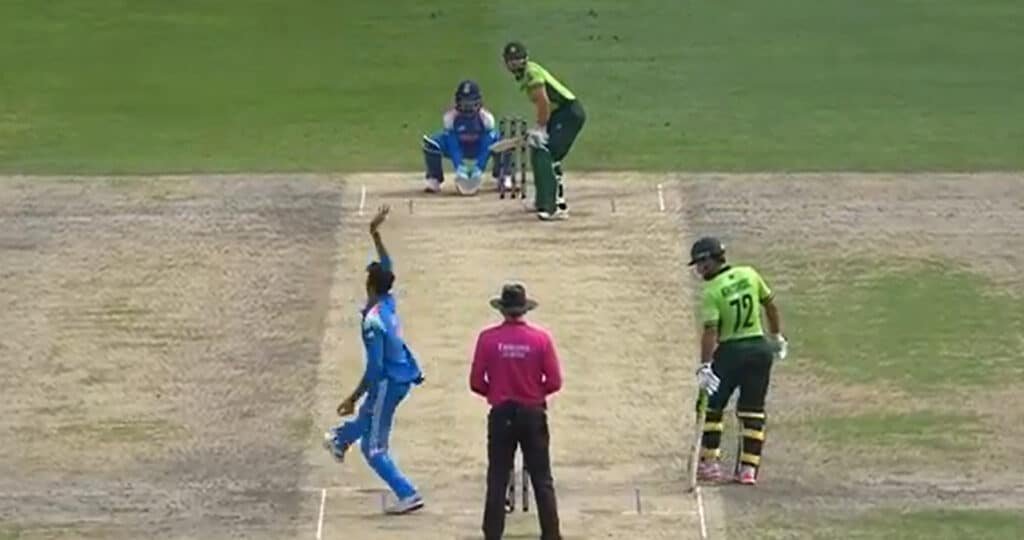ایک موقع پر بابر اعظم نے شاندار کور ڈرائیوز لگانا شروع کیں تو بھارتی کھلاڑیوں میں پریشانی کے آثار نظر آنے لگے لیکن اسی دوران پاکستان کی پہلی وکٹ 8.2 اوورز میں 41 رنز پر جبکہ دوسری وکٹ 47 رنز پر گر گئی۔