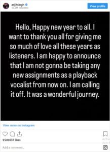 اریجیت سنگھ نے سوشل میڈیا پلیٹ فارم انسٹاگرام پر ایک پیغام کے ذریعے اپنے اس اہم فیصلے سے مداحوں کو آگاہ کیا۔
