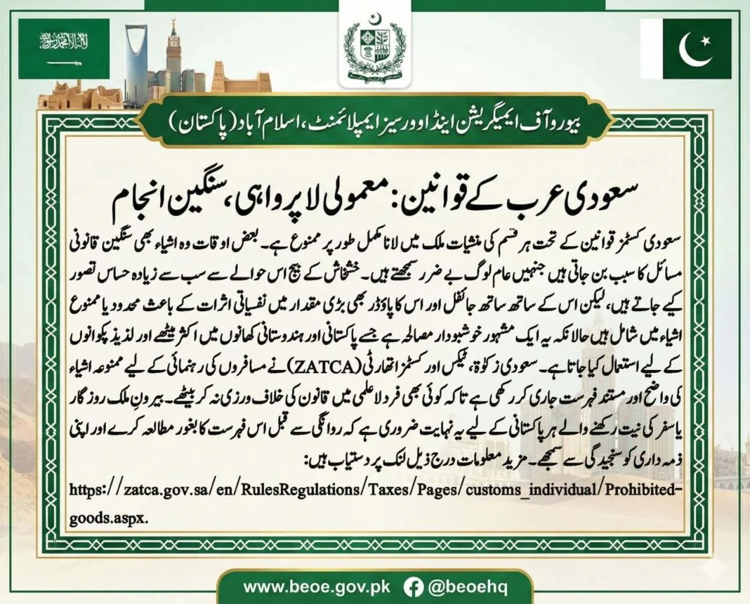 بیورو آف ایمیگریشن اینڈ اوورسیز ایمپلائمنٹ نے بتایا کہ سعودی زکوٰۃ، ٹیکس اور کسٹمز اتھارٹی نے مسافروں کے لیے ممنوعہ اشیاء کی مستند فہرست جاری کر رکھی ہے تاکہ کوئی بھی شخص لاعلمی میں قوانین کی خلاف ورزی نہ کرے۔