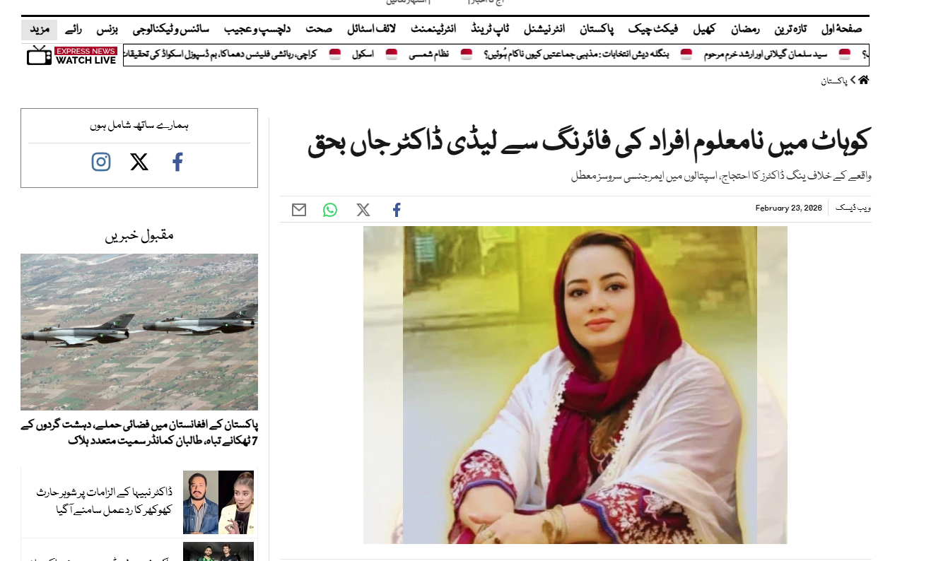 اتوار کے روز کوہاٹ ڈسٹرکٹ ہسپتال میں ڈیوٹی کے بعد گھر واپسی پر نامعلوم افراد نے ڈاکٹر مہوش حسنین کو فائرنگ کر کے قتل کر دیا تھا۔ اس لرزہ خیز قتل کے خلاف ینگ ڈاکٹرز ایسوسی ایشن اور سماجی حلقوں کی جانب سے شدید احتجاج کیا گیا اور ضلع بھر میں طبی سہولیات کی فراہمی معطل کر دی گئی۔