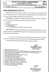 شمالی وزیرستان میں عید الفطر کے موقع پر امن و امان کی صورتحال برقرار رکھنے اور شہریوں کی جان و مال کے تحفظ کے لیے ضلعی انتظامیہ نے ضلع بھر میں دفعہ 144 نافذ کر دی ہے۔