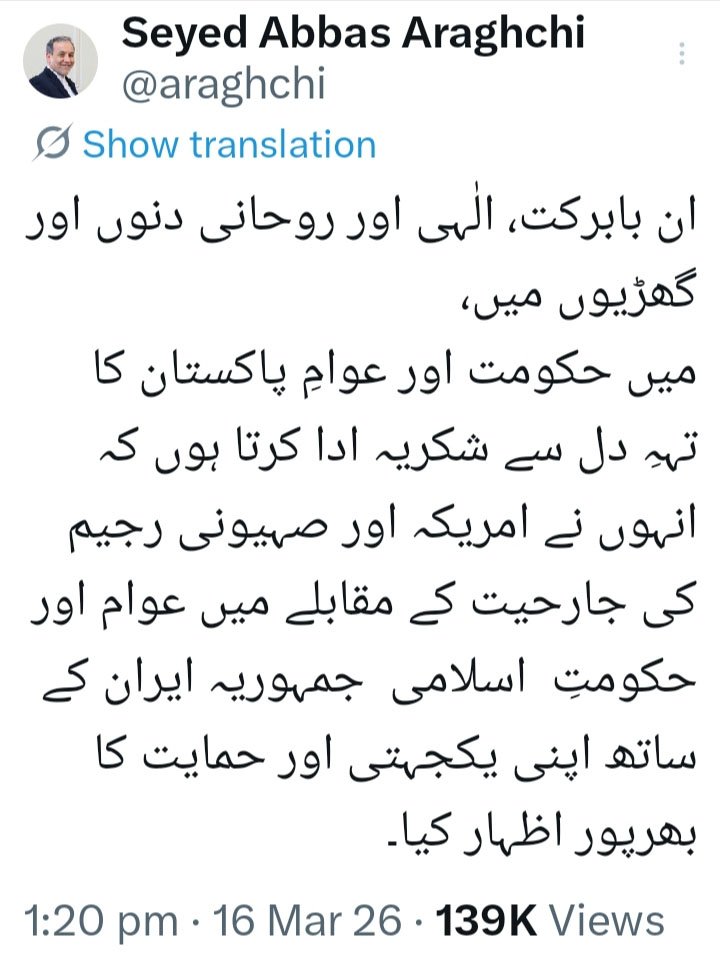ایرانی وزیر خارجہ نے زور دیا کہ امریکی اور صہیونی جارحیت کے خلاف پاکستان کی حکومت اور عوام نے ثابت قدمی سے یکجہتی کا مظاہرہ کیا، جس پر ایران تہہ دل سے شکر گزار ہے۔ عباس عراقچی کے مطابق اس طرح کے اقدامات خطے میں دوستی، اعتماد اور تعاون کو مضبوط کرتے ہیں۔